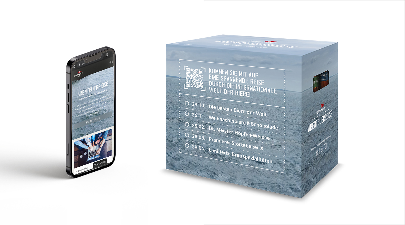 Und wieder nimmt die berühmte Störtebeker Kogge den Bierkenner mit auf die Reise. Als Keyvisual von Abenteuerbox, Website und Filmtrailer weckt sie das Fernweh und die Sehnsucht nach echtem Biergenuss . Der gesprayte Schriftzug, der sich sowohl im Online-Auftritt als auch auf dem Verkostungspaket widerfindet, zitiert die Welt der Häfen, Container-terminals und Frachtschiffe. Ein Vorgeschmack auf Seeluft und ehrliche Braukunst.