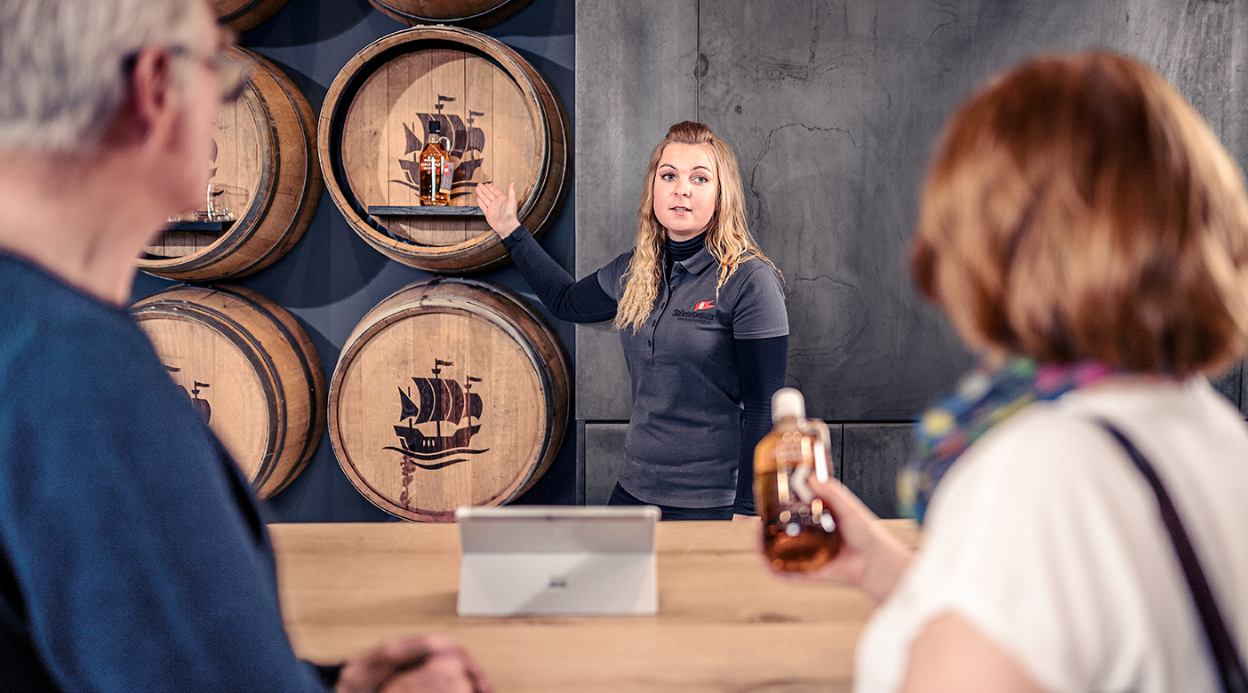 Stilisiert, als Original und kombiniert mit modernem Mobiliar leitet das Whiskyfass den Besucher durch die Ostseelandschaft in die Tiefen der Brennerei, wo persönliche Whiskyrezepturen in Eichenfässern reifen.