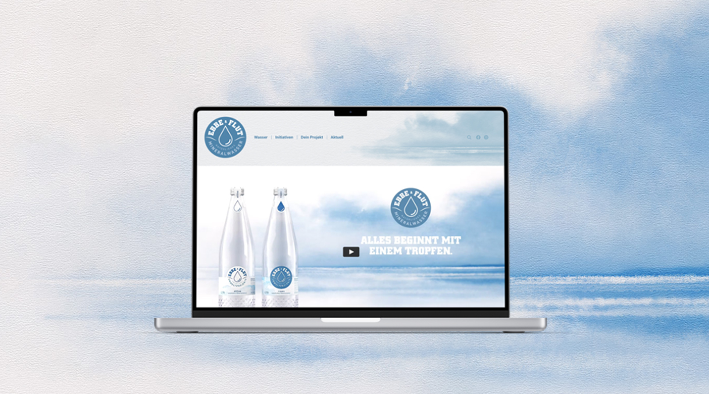 Ein kräftiges Blau neben strahlendem Weiß: Die Farben des Logos und der Flaschenlabels geben den visuellen Ton an – nur unterbrochen von dezenten grünen Akzenten. Wie ein Aquarell präsentiert sich die Startseite des Onlineauftritts und zeigt sofort, worum es geht: das Element Wasser und seine Kraft. Mit einem Klick gerät es in Bewegung und zeichnet ein Bild von einem nachhaltigen Leben.